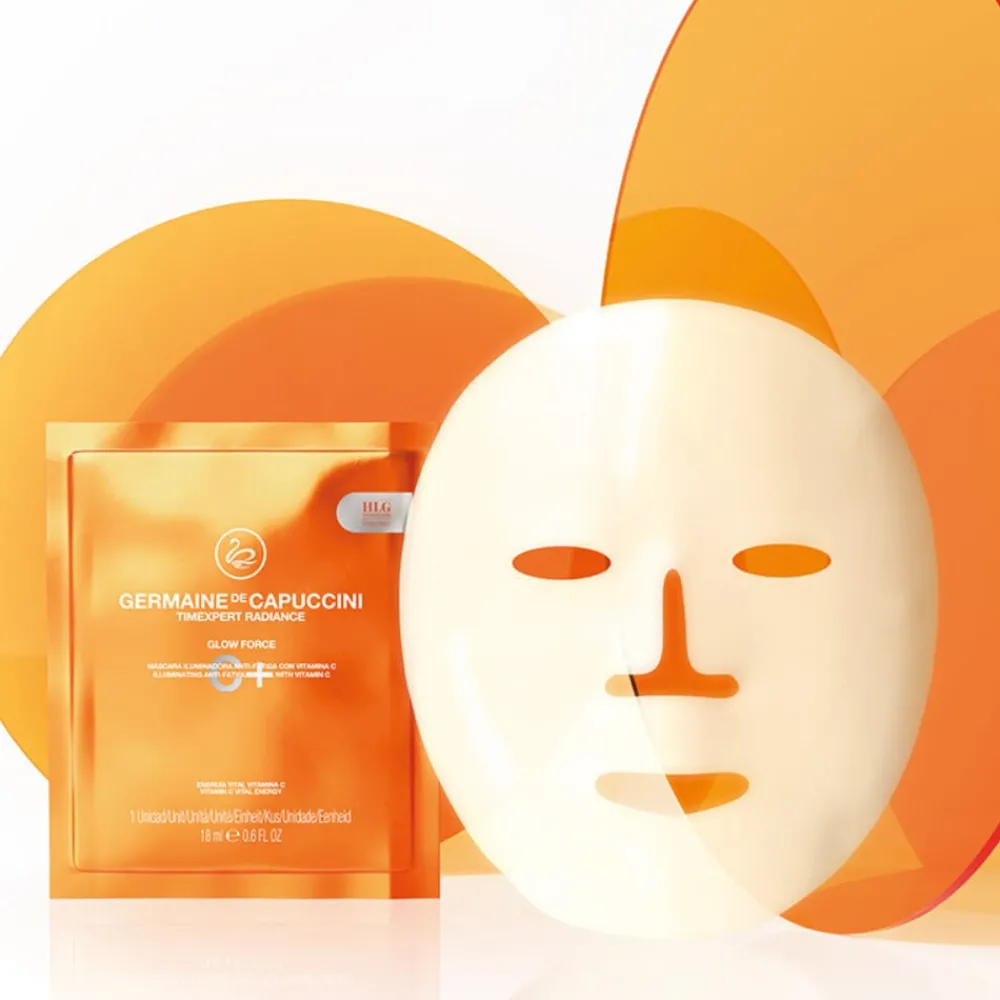 Germaine De Capuccini Radiance C+ Glow Force Sheet Mask Kan brukes til spesielle anledninger for umiddelbar askepotteffekt eller som en ukentlig behandling for en ungdommelig hud full av glød og energi. Ansiktet blir strålende, og huden fpr en nydelig glød. Reduserer pigmentflekker, og hudtonen blir jevnere. Huden bkir fuktet, fastere og sunnere. Inneholder Germaine sin patenterte HLG Nanopolymer for en C-vitamin behandling som er x6 ganger mer effektiv. HLG har en kraftig fuktighetsgivende aktivitet i seg selv, samtidig som den tillater en vedvarende frigjøring av de aktive ingrediensene, gir dyp næring ved å trenge ned i dypere hudlag og virke på cellenivå. En sann formuleringsrevolusjon, eksklusivt patentert av Germaine de Capuccini.