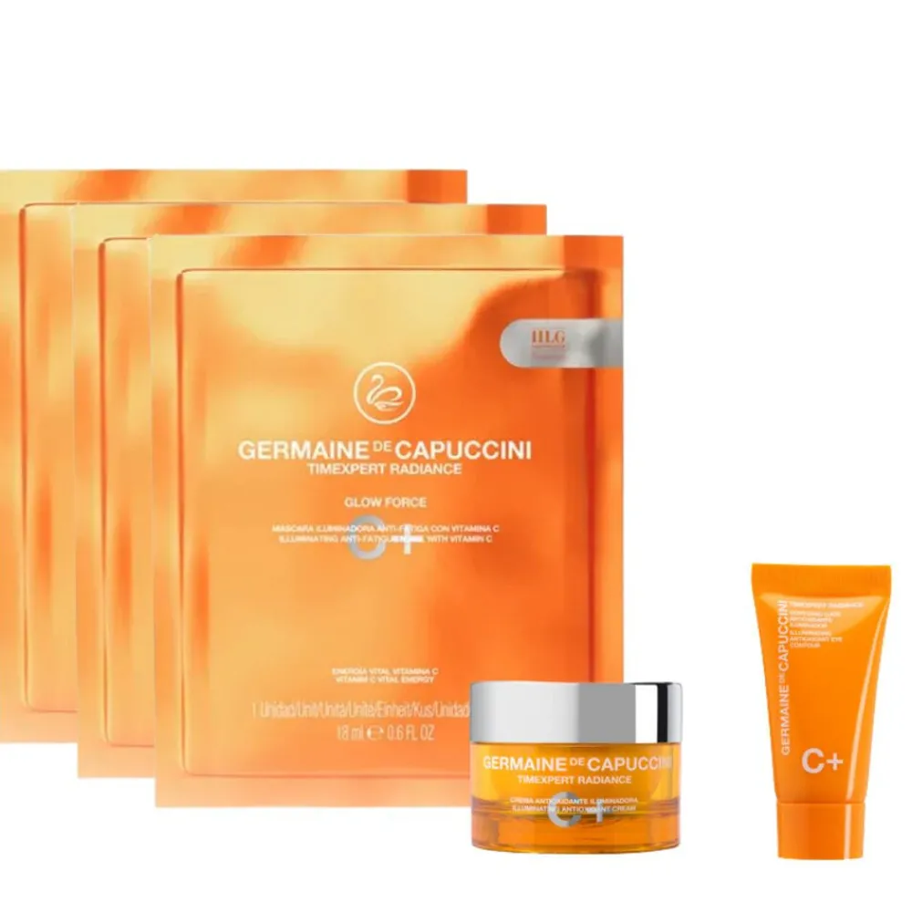 Germaine De Capuccini Radiance C+ Glow Force Sheet Mask(x3) Kan brukes til spesielle anledninger for umiddelbar askepotteffekt eller som en ukentlig behandling for en ungdommelig hud full av glød og energi. Ansiktet blir strålende, og huden fpr en nydelig glød. Reduserer pigmentflekker, og hudtonen blir jevnere. Huden bkir fuktet, fastere og sunnere. Inneholder Germaine sin patenterte HLG Nanopolymer for en C-vitamin behandling som er x6 ganger mer effektiv. HLG har en kraftig fuktighetsgivende aktivitet i seg selv, samtidig som den tillater en vedvarende frigjøring av de aktive ingrediensene, gir dyp næring ved å trenge ned i dypere hudlag og virke på cellenivå. En sann formuleringsrevolusjon, eksklusivt patentert av Germaine de Capuccini.