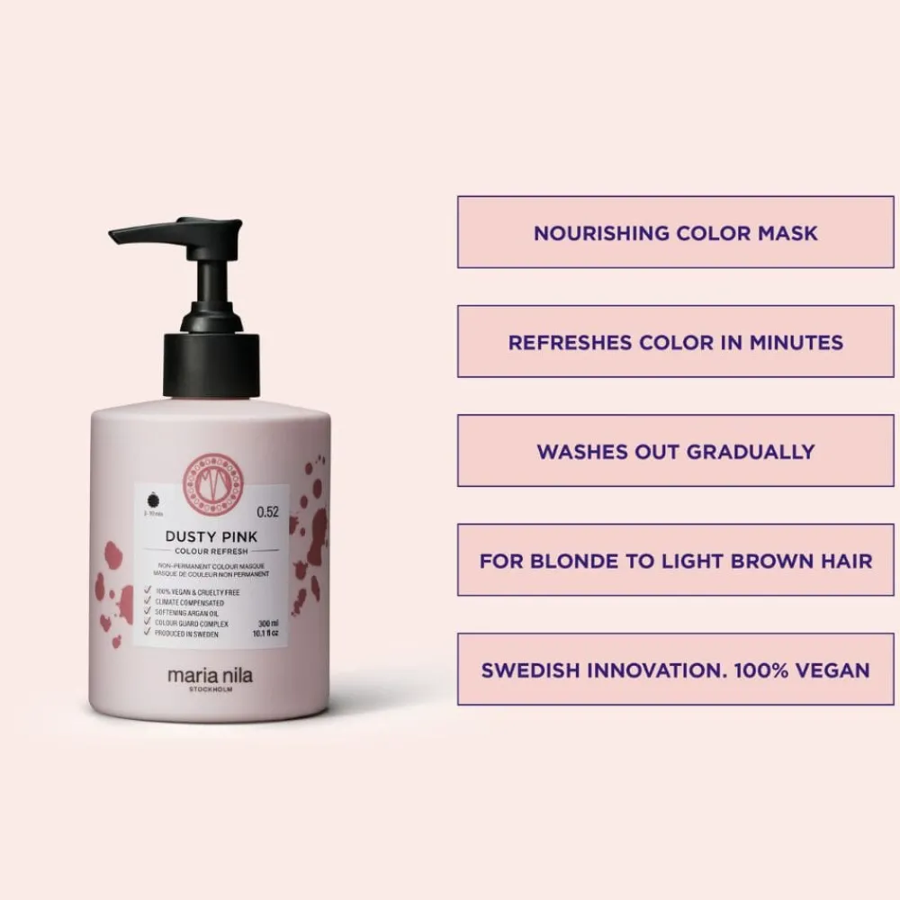 Maria Nila Colour Refresh Cool Cream er en næringsrik fargemaske med ikke-permanente fargepigmenter som frisker opp håret og får frem dampede rosa toner. Arganolje gir fuktighet og reduserer krus for et silkemykt og glansfullt resultat. Alle farger kan blandes med White Mix for å skape pastelltoner, eller man kan mikre to farger for din helt egne, unike farge. Colour Refresh er perfekt til bruk mellom fargetimer hos frisøren, eller før spesielle anledninger.