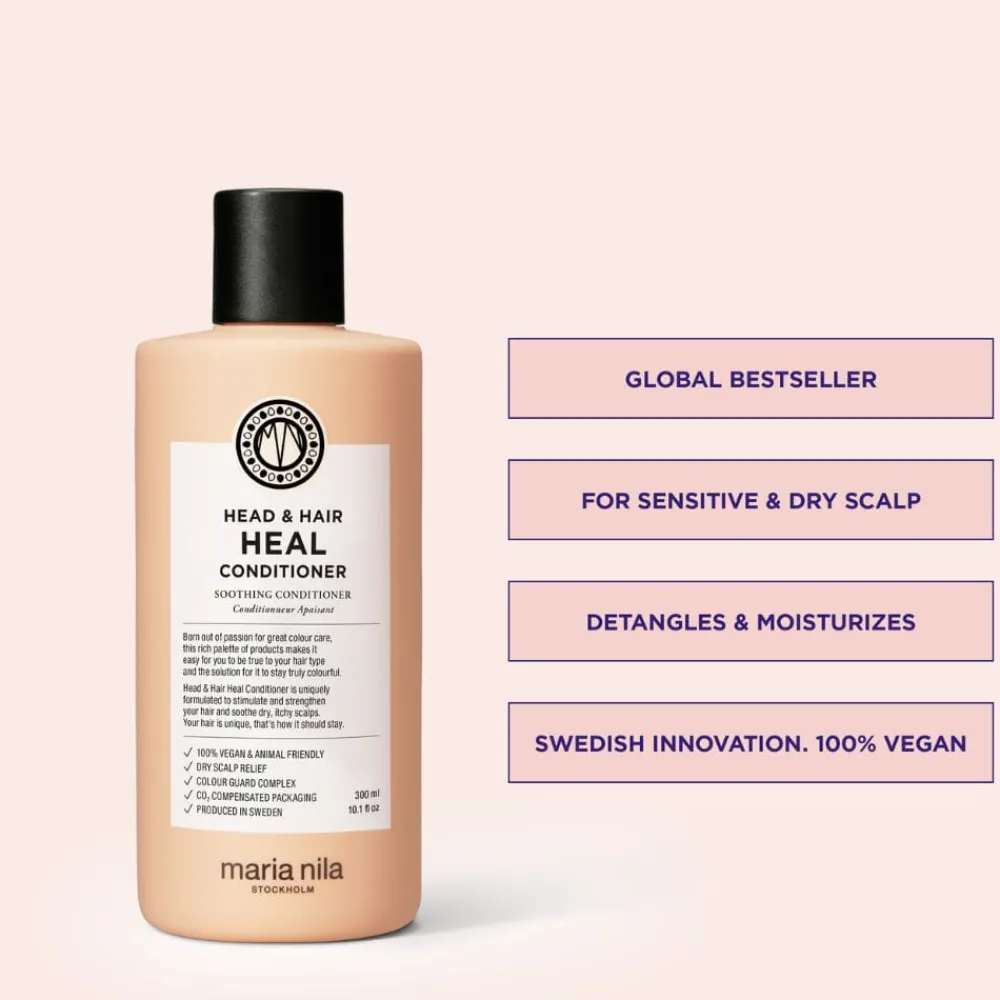 Maria Nila Head & Hair Heal Conditioner er en beroligende og antiinflammatorisk balsam som stimulerer til økt hårvekst. Formulert med aktive ingredienser som motvirker flass og andre hodebunnsrelaterte plager. I tillegg vil apigenin og peptider stimulere hårsekkene og forbedre hårstruktur- og vekst. Colour Guard Complex som beskytter for fargetap fra hårvask, styling og UV-stråler. Masken har allergenfri parfyme med en blomstret duft av hvit jasmin og lindeblomst.