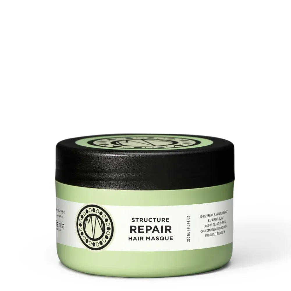 Maria Nila Structure Repair Masque er en effektiv hårkur som mykgjør og gir fuktighet til skadet, tørt og kjemisk behandlet hår. Reparerende algeekstrakt hjelper håret med å komme tilbake til sin naturlige styrke ved å gi glans og mykne opp. Masken er full av næringsgivende ingredienser, i tillegg til Colour Guard Complex som beskytter mot fargetap fra hårvask, styling og UV-stråler. Dufter av vanilje, rose og jasmin.
