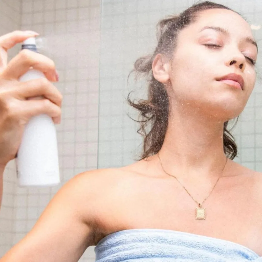 - Spray over ansikt og hals etter rens, morgen og kveld. Pass på å holde øynene lukket!