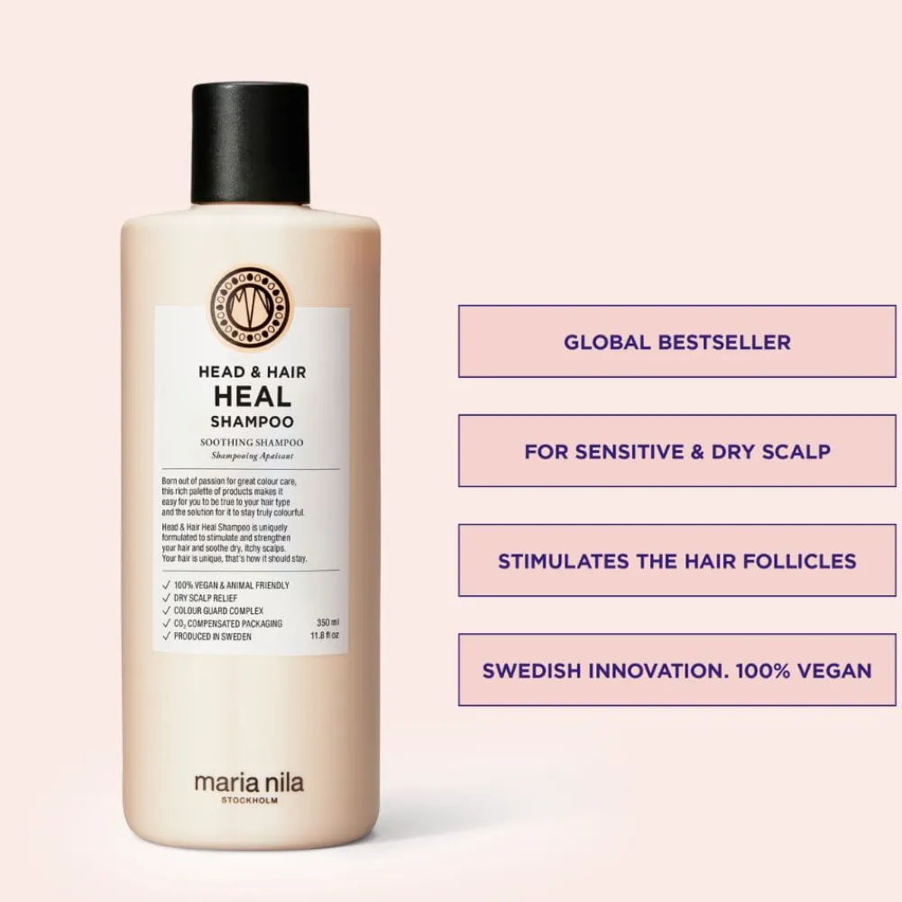 Maria Nila Head & Hair Heal Shampoo er en beroligende og antiinflammatorisk sjampo som stimulerer til økt hårvekst, og som er perfekt for å opprettholde en sunn hodebunn. Formulert med aktive ingredienser som motvirker flass og andre hodebunnsrelaterte plager. I tillegg vil apigenin og peptider stimulere hårsekkene og forbedre hårstruktur- og vekst, mens Colour Guard Complex beskytter for fargetap fra hårvask, styling og UV-stråler. Sjampoen har allergifri parfyme med en blomstret duft av hvit jasmin og lindeblomst.